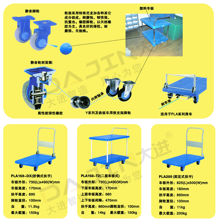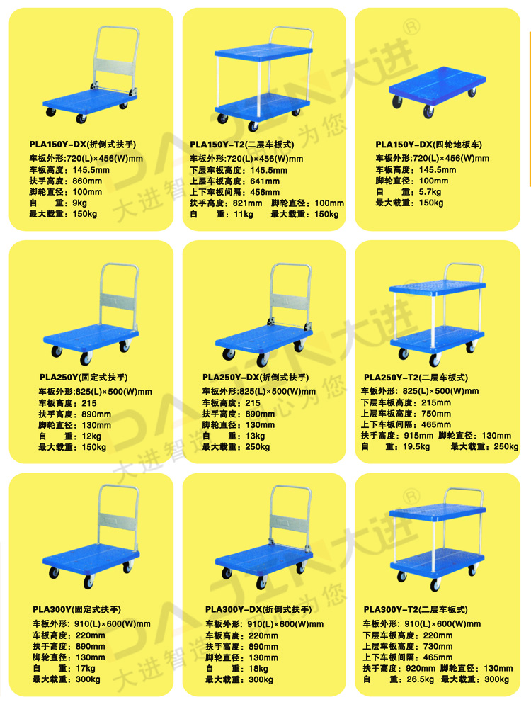 大进手推车具有结构简单、轻巧,使用方便等特点,适用于社会各大行业。主要产品有静音手推车、多层框架车和铁板推车等。