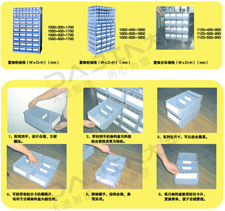 5、与置物柜,置物台车等工位器具产品配套使用可充分利用空间,零配件存取方便,起到有效的管理。